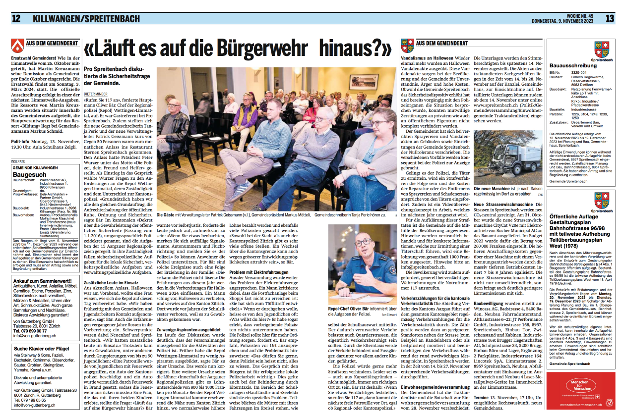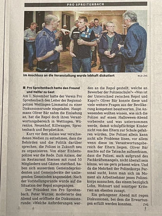 Hauptmann Oliver Bär nahm die Einladung von PRO Spreitenbach an und besuchte uns am 1.11.23 im Restaurant Sternen. Er ist zuständig für die Regional Polizei (Repol) in den Gemeinden Wettingen, Würenlos, Neuenhof, Killwangen, Spreitenbach und Bergdietikon. Kurz zuvor war aus den Medien zu entnehmen, dass die Behörden und die Politik darüber sprechen, die Zukunft der Aargauer Polizei neu zu organisieren. Von einer Einheitspolizei ist die Rede und dies ist von grossem öffentlichem Interesse besonders in Bezug auf die möglichen organisatorischen Veränderungen in Zukunft. Zu diesem Anlass haben sich auch Gemeindepräsidenten und Gemeinderäte der umliegenden Gemeinden angemeldet. Nach der Vorstellungsrunde von der Gemeindeschreiberin Tanja Peric und des Verwaltungsleiter Patrick Geissmann aus Spreitenbach wurde auf die Situation der Repol eingegangen.